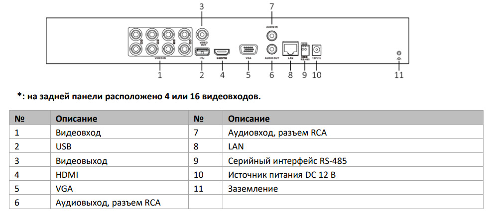 *** Количество аудиовходов и тревожных входов / выходов указано для справки. На этикетке приведены параметры аудиовходов и тревожных входов / выходов. Например, «4A + 8 / 4ALM» означает, что устройство имеет 4 аудиовхода, 8 тревожных входов и 4 тревожных выхода. Если устройство имеет только 1 аудиовход, описание может не быть указано на этикетке.