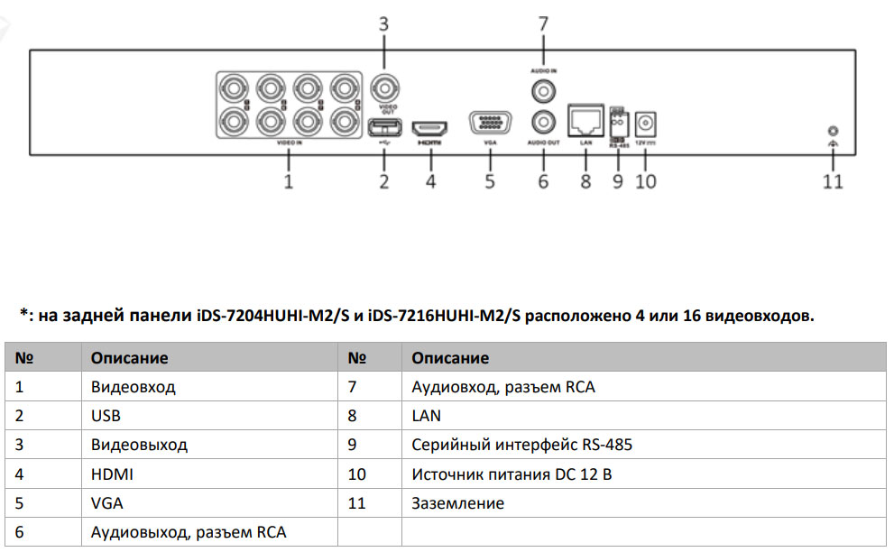 *** Количество аудиовходов и тревожных входов / выходов указано для справки. На этикетке приведены параметры аудиовходов и тревожных входов / выходов. Например, «4A + 8 / 4ALM» означает, что устройство имеет 4 аудиовхода, 8 тревожных входов и 4 тревожных выхода. Если устройство имеет только 1 аудиовход, описание может не быть указано на этикетке.