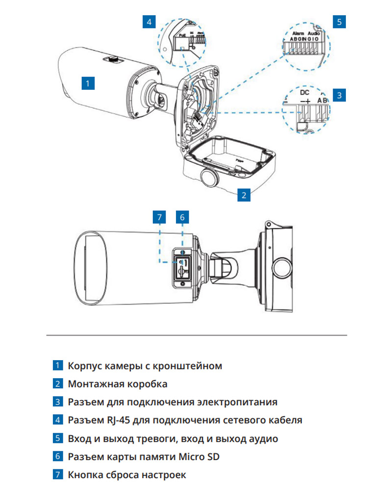 • Передача аудио: двунаправленная, форматы сжатия G.711/AAC/G.722/G.726, 8/16/32/44.1/48 кГц, 16 — 256 кбит/сек.