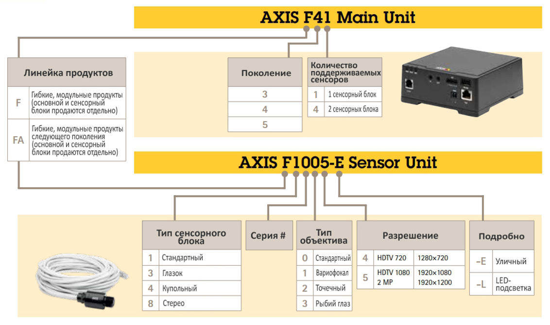 Конструкция моделей серии AXIS F основана на концепции разделенной сетевой камеры, согласно которой камера состоит из двух частей (модулей): оптического блока, который включает в себя объектив и датчик изображений с кабелем, и основного блока, который, собственно, и является камерой. Такая модульная конструкция обеспечивает гибкость в выборе аппаратных компонентов и способов установки системы. Компактные оптические блоки можно малозаметно размещать даже в ограниченном пространстве, а базовый блок, подключаемый длинным кабелем, можно располагать в свободном место там, где это удобно сделать. После первоначальной установки оптический или основной блок легко переместить в другое место или заменить, что еще больше повышает гибкость конфигурации системы.