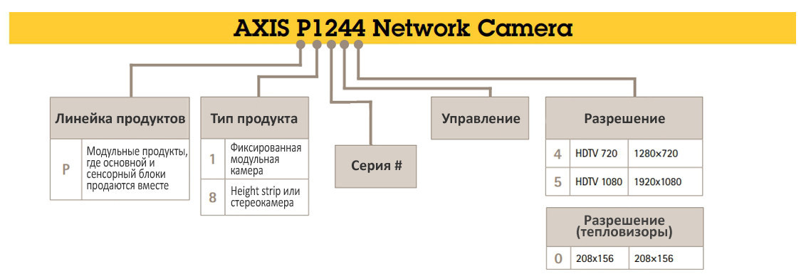 Модель AXIS P1244 включает в себя следующие компоненты: оптический блок AXIS F1004, состоящий из объектива и датчика изображений, и основной блок AXIS P12 Mk II, который представляет собой корпус камеры. Оптический блок комплектуется отсоединяемым кабелем длиной 8 м для подключения к основному блоку. Этот кабель позволяет размещать основной блок на некотором расстоянии от точки наблюдения — там, где для него есть место.