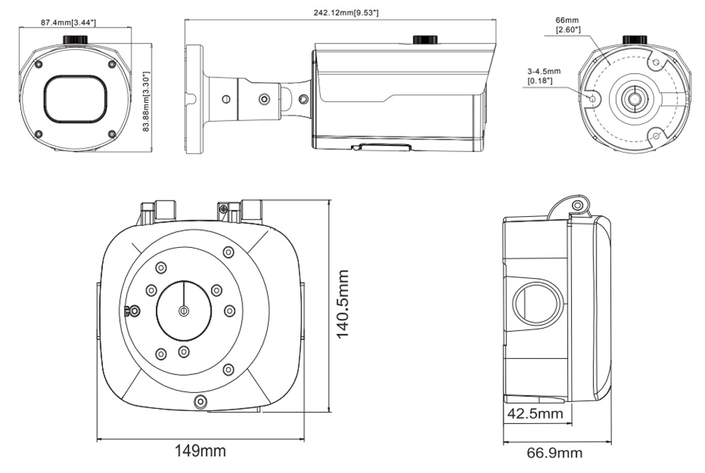 Корпус устройства выполнен из прочного металла с цилиндрической формой и классом защиты IP66, что гарантирует надёжную защиту от влаги, пыли и механических воздействий. Камера оснащена тревожными входами/выходами, поддерживает карты памяти microSD объёмом до 256 ГБ, а также может питаться как по технологии PoE (802.3af), так и от 12В постоянного тока.