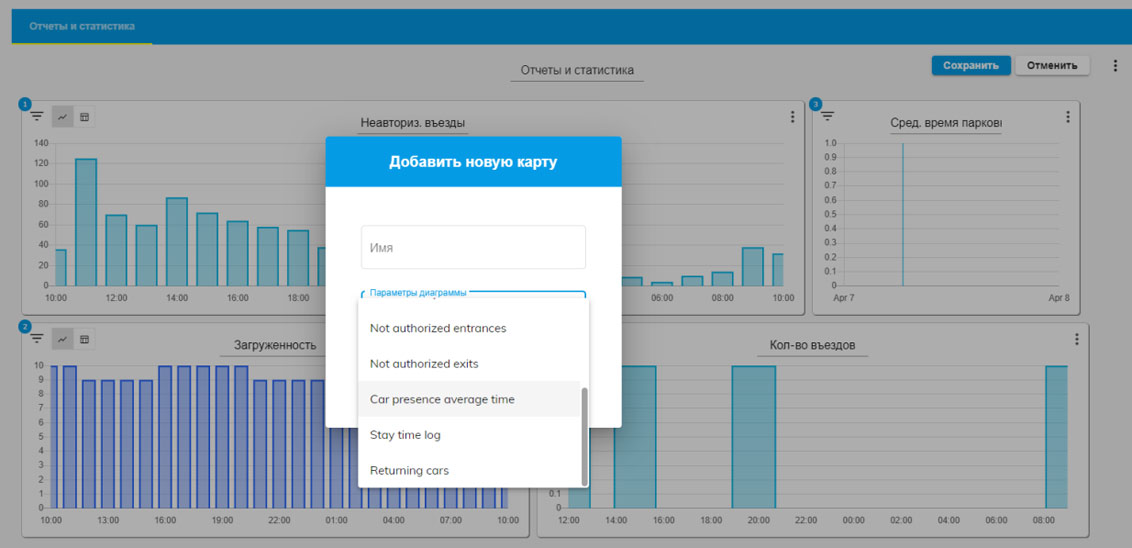 Есть возможность сформировать различны отчеты (заполняемость, среднее время стоянки, загруженность и тд.)
