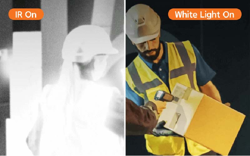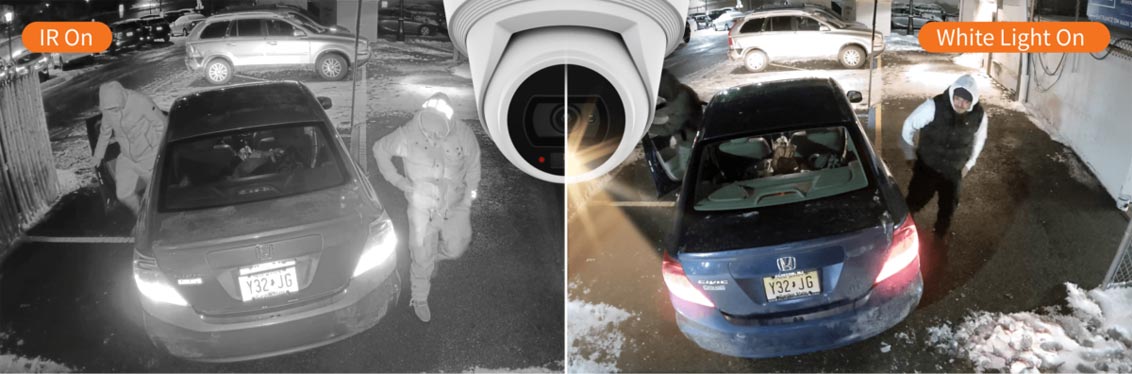 Al-камера Q серии с двойным освещением оснащена светодиодом теплого белого цвета мощностью 3000 К, который осветляет слабо освещенные помещения. В отличие от ИК-излучения, теплый белый свет позволяет идентифицировать цвет в ночное время и не размывает отражающие поверхности.