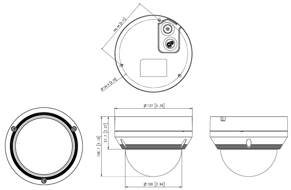 Камера работает при питании DC 12V/ PoE (IEEE802.3af, Class3) и имеет потребление максимум 6.5Вт (при 12VDC) или максимум 7.7Вт (при PoE). Она может работать в температурном диапазоне от -30°C до +55°C (холодный старт до -20°C). Камера имеет алюминиевый корпус и соответствует классу защиты IP66, IK10, что обеспечивает надежную защиту от влаги и механических повреждений.