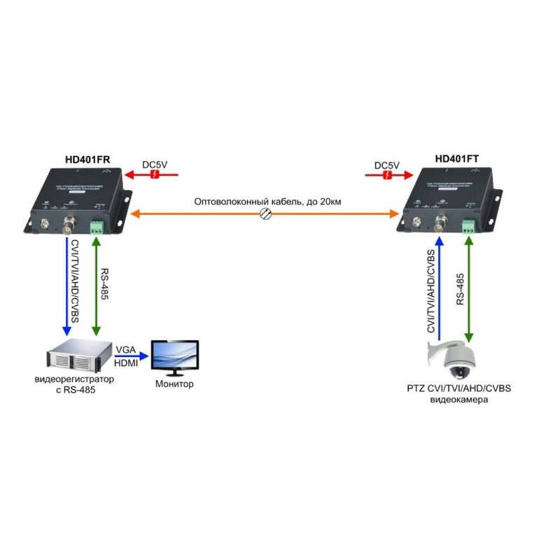 Данный комплект предназначен для передачи видеосигнала HDCVI/HDTVI/AHD/CVBS и сигнала управления RS485 по одномодовому оптоволоконному кабелю на расстояние до 20км.