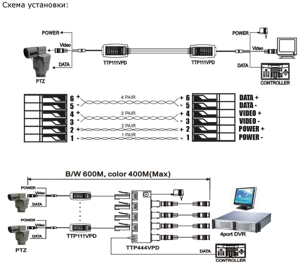 • Используется для передачи цветного видеосигнала на расстояние до 400 метров, черно-белого видеосигнала - до 600 метров В случае применения вместе с TTP111VPD возможно осуществлять передачу по 4 каналам и 4 кабелям категории 5 видеосигнала, питания и команд.