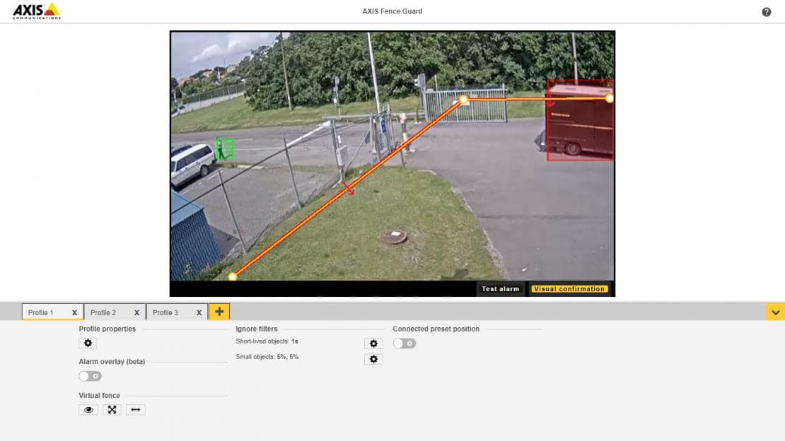 Приложение AXIS Fence Guard легко установить и настроить. Это приложение позволяет создавать несколько профилей для разных конфигураций. Каждый профиль поддерживает одну линию детекции. Можно использовать несколько профилей одновременно или каждый профиль по отдельности. Таким образом вы можете настраивать варианты реагирования на разные события, а также настраивать инициирующие события в зависимости от времени суток.