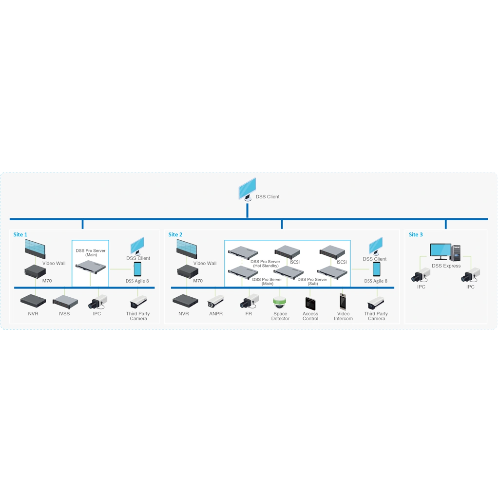 - Масштабируемая архитектура, простое расширение. Благодаря распределенной конфигурации вы можете легко увеличить количество поддерживаемых каналов до 20 000 и емкость централизованного хранилища до 4 петабайт. Мультисерверная конфигурация позволяет вам объединить множество платформ DSS и удобно работать с ними через одно клиентское приложение на ПК. Вы можете просматривать видео в реальном времени и в архиве, отслеживать события в реальном времени и в архиве, а также иметь доступ ко многим другим функциям.