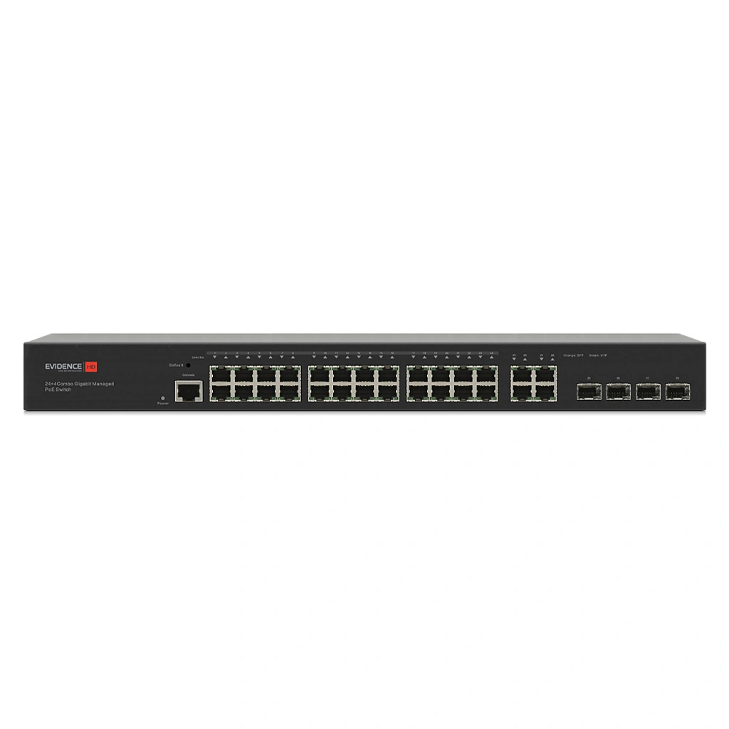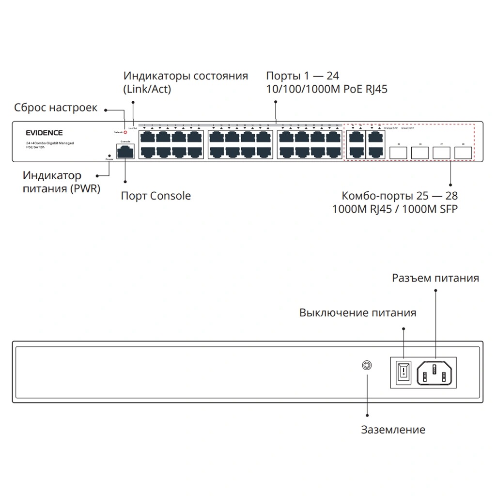 Коммутатор имеет 24 гигабитных порта для подключения PoE-устройств, а также 4 комбинированных порта для подключения серверов или других коммутаторов по витой паре или оптической линии.