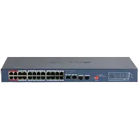 - 28-портовый коммутатор: 24 × RJ-45 PoE + 2 × RJ-45 uplink + 2 × SFP uplink.