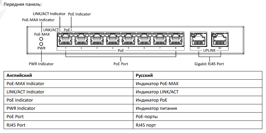 • Количество портов: 8 × 10/100M PoE-портов, 2 × Gigabit RJ45 порта