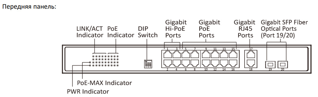• Количество портов: 12 × Gigabit PoE-портов, 4 × Gigabit Hi-PoE-порта, 2 × Gigabit RJ45 порта и 2 × Gigabit оптоволоконных порта