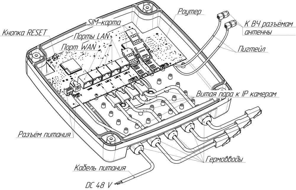 Комплект представляет из себя MIMO антенну усилением 15 дБ, выполненную в герметичном всепогодном корпусе. В антенне расположен роутер с 5 портами Ethernet 100Base-Tx (4 порта с поддежркой PoE48, 1 порт - WAN с PoE IN). Таким образом комплект позволяет подключить до 4 IP-видеокамер с подачей питания по LAN кабелю RJ-45 (PoE48V) и возможностью автоматической перегрузки любой из камер в случае её зависания.
