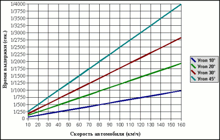 К примеру, для угла установки камеры в 20° и скорости 80 км/ч необходимо установить выдержку 1/1000 секунды (см. график).