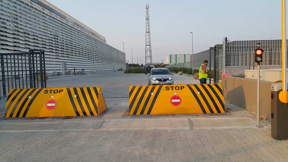 Скрытая конструкция шарнирного соединения без выпуклостей, расположенная ниже уровня земли, позволяет автотранспортным средствам проезжать плавно и бесшумно. Противоударное устройство имеет специальную усиленную конструкцию на основе прочной V-образной вертикальной панели толщиной 6 мм для распределения ударной нагрузки, которая крепится к основному шасси на расстоянии 350 - 550 мм. Каждая панель распределения ударной нагрузки опирается на четыре сплошных стальных стержня сечением 30 x 10 мм, размещенных на равном расстоянии друг от друга с целью получения прочной стальной конструкции. Удары поглощаются и сдерживаются панелями распределения ударной нагрузки совместно со стальными стержнями толщиной 10 мм, прикрепленными к их V-образным передним сторонам, и держателями специальной формы.