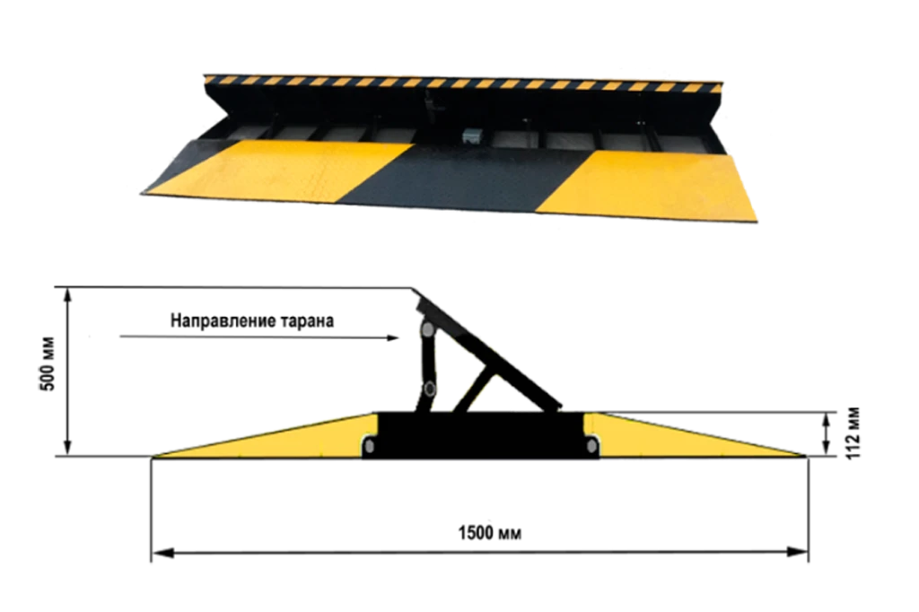 Конструкция выполнена в виде лежачего полицейского с плоской верхней частью и пологими рифлёными скатами, что обеспечивает отличное сцепление колес и исключает соскальзывание. В штатном режиме устройство управляется электромеханическим приводом, а при отключении питания — с помощью ручного механизма. В закрытом положении блокиратор не мешает движению, обеспечивая проезд любому транспорту. Для синхронного перекрытия широких проездов возможна установка нескольких устройств в линию.