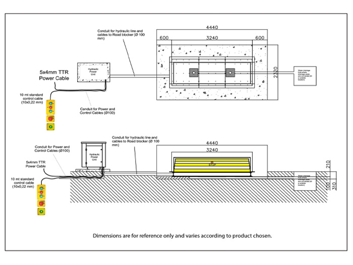 Стандартная работа ~ 3-5 с (подъем/опускание) в зависимости от размеров дорожного заграждения. Быстрый подъем (аварийная функция быстрого срабатывания (EFO), посредством опционального гидроаккумулятора) ~ 1 - 1,5 с; может отличаться в зависимости от размеров дорожного заграждения для заграждений шириной более 4,0 м.
