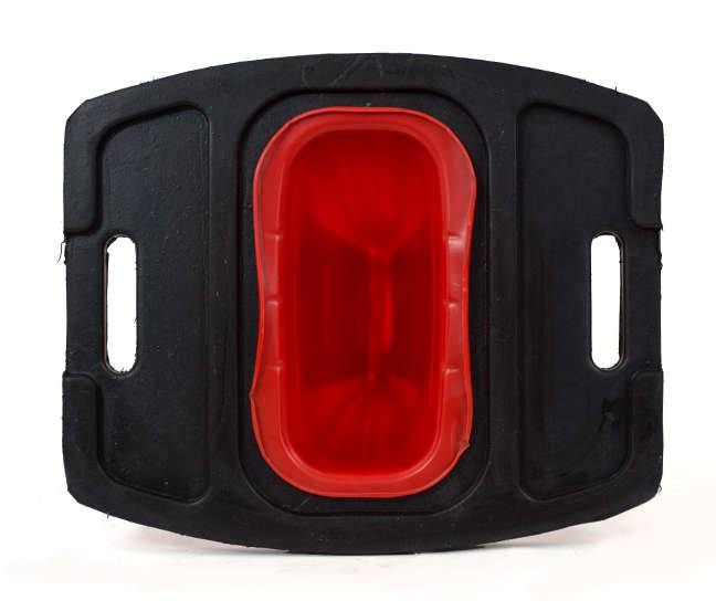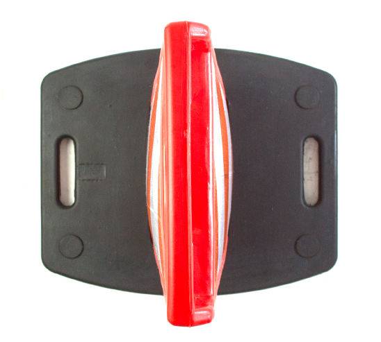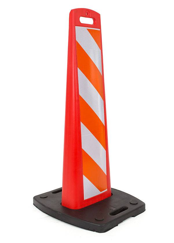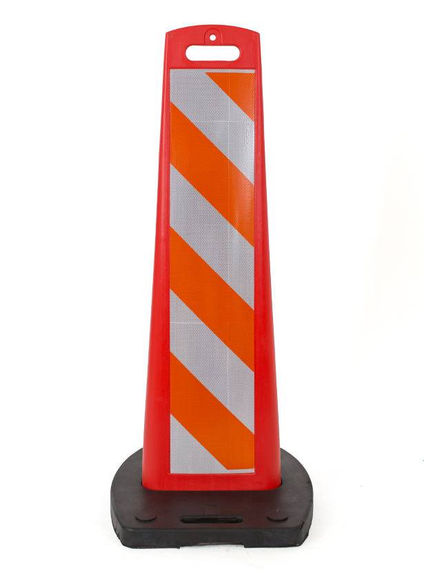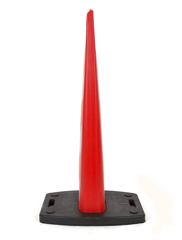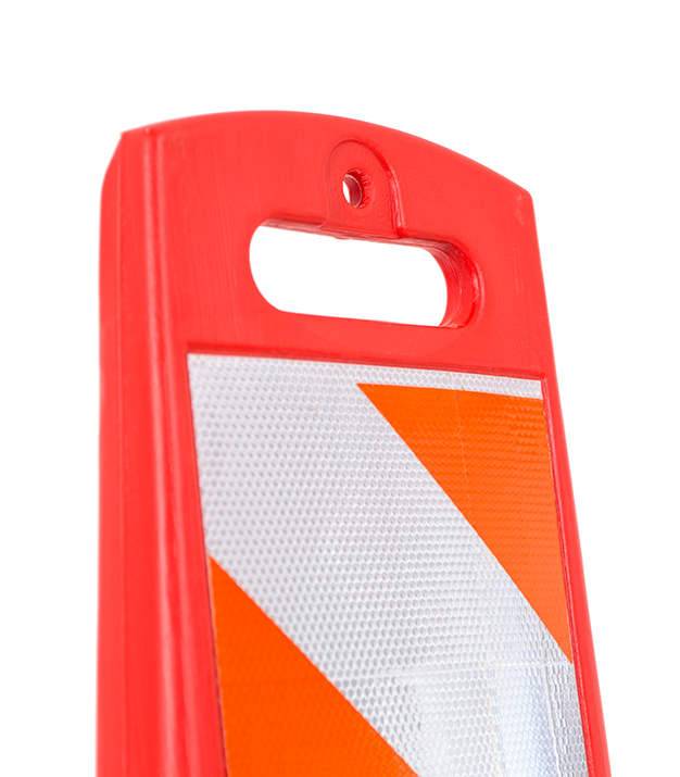 Панель прямоугольной конической формы из красного пластика с нанесенными свотоотражающими полосками красного и белого цветов (по заказу возможно нанесение любого изображения). В верхней части панели имеется ручка для удобства переноса. Также имеется отверстие для присоединения цепи. Основа - резиновая подставка прямоугольной формы. Подставка надевается на панель сверху и надежно фиксируется в нижней части. Со снятым основанием солдатики вставляются один в другой для удобного и компактного хранения и транспортировки. Подставка оснащена ручками для удобства переноса.