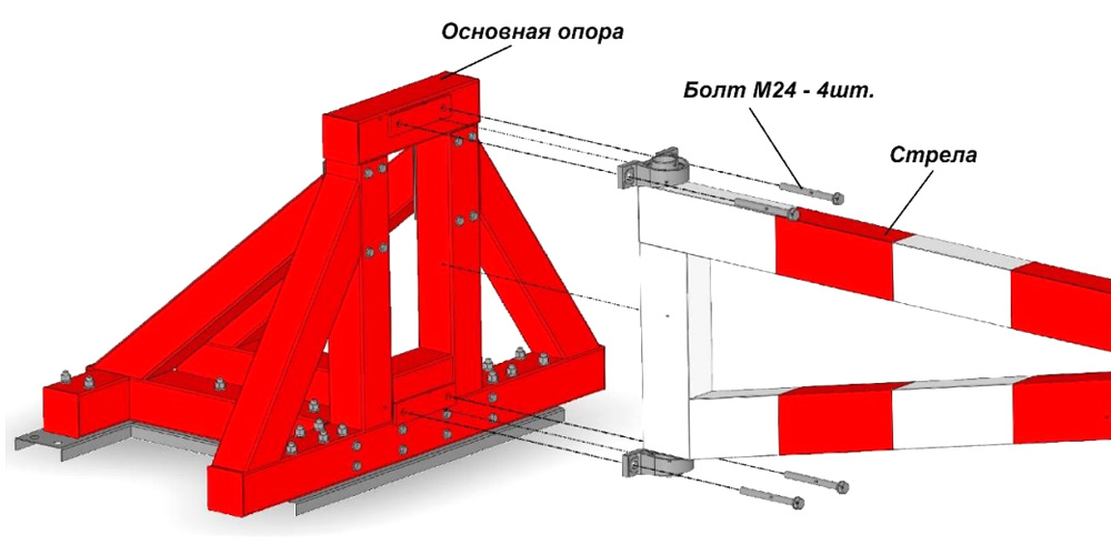Основная часть стрелы устанавливается на основную опору и закрепляется болтами. Дополнительная часть стрелы стыкуется с основной и скрепляется болтами.