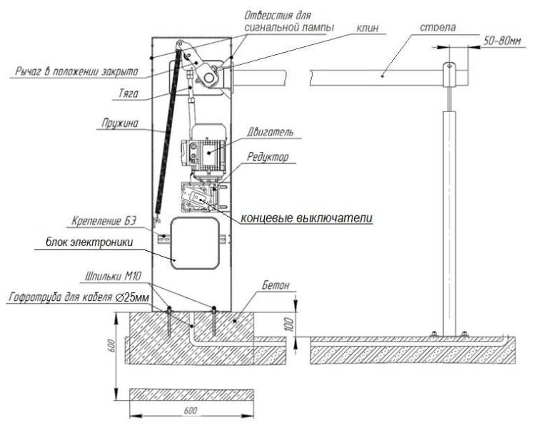 Шлагбаум следует установить на фундамент размером 600x600x600 из бетона марки не ниже М400. При заливке необходимо использовать монтажный комплект: монтажную раму и анкеры, при этом каждый анкер должен выступать над поверхностью фундамента своей резьбовой частью на высоту не менее 40 мм. Сам фундамент должен выступать над уровнем проезжей части не менее 100мм.
