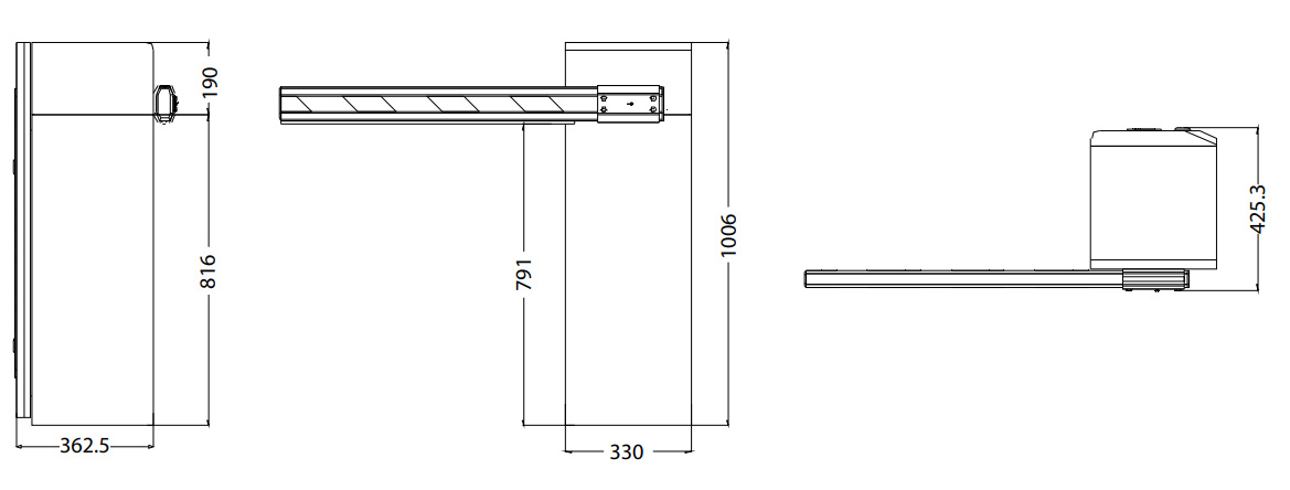 Степень защиты: IP54. Диапазон рабочих температур: от -40°C до +75 °C. Габаритные размеры тумбы шлагбаума: 360 х 330 х 1000 мм. Вес: 48 кг.