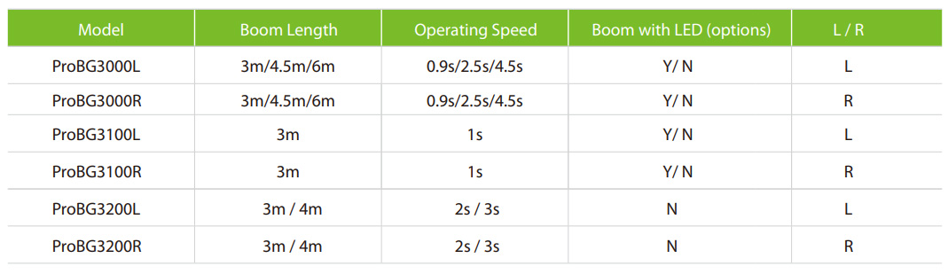 ProBG3030 имеет два варианта исполнения: ProBG3060L (тумба слева, стрела справа) и ProBG3060R (тумба справа, стрела слева)