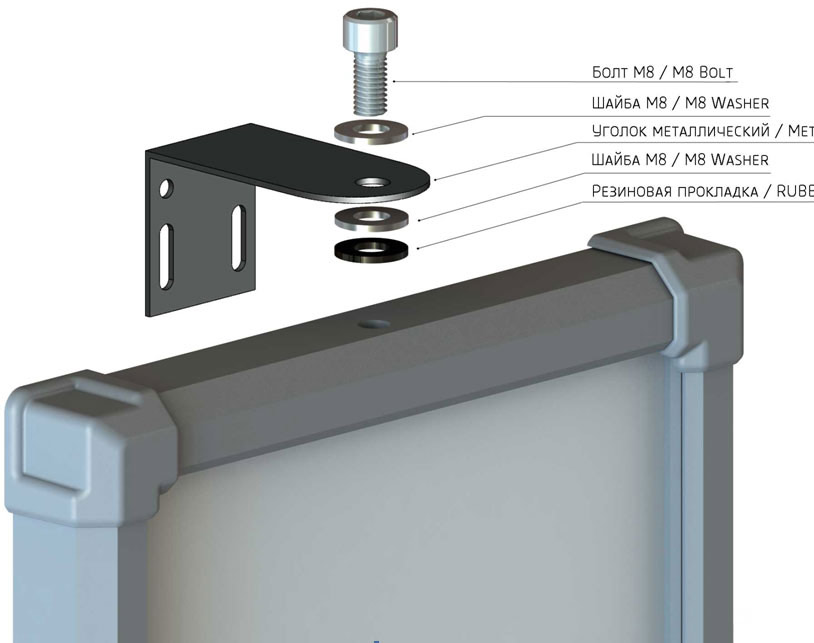 Крепление с помощью металлических кронштейнов на вертикальную плоскость или с помощью подвесов к потолочной системе.