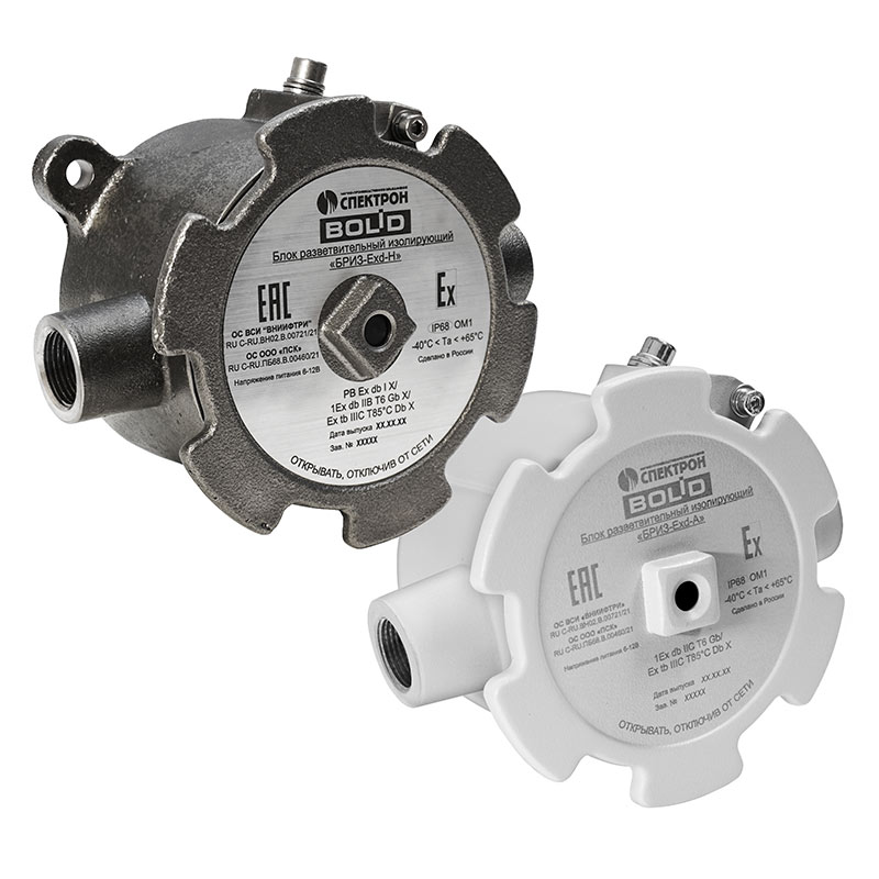 БРИЗ-Exd-Н представляет собой блок разветвительно-изолирующий взрывозащищённый, разработанный для применения в двухпроводных линиях связи контроллеров С2000-КДЛ в составе интегрированной системы охраны «Орион». Применяется с целью изолирования короткозамкнутых участков ДПЛС с последующим автоматическим восстановлением после устранения короткого замыкания. Устанавливается в различных закрытых помещениях и открытых площадках с взрывоопасными зонами «1», «2», «21», «22». Также БРИЗ-Exd-Н в подземных выработках шахт, рудников и их наземных строениях. Выполнен в соответствии требованиям на взрывозащищенное оборудование с видом взрывозащиты «взрывозащитная оболочка d».