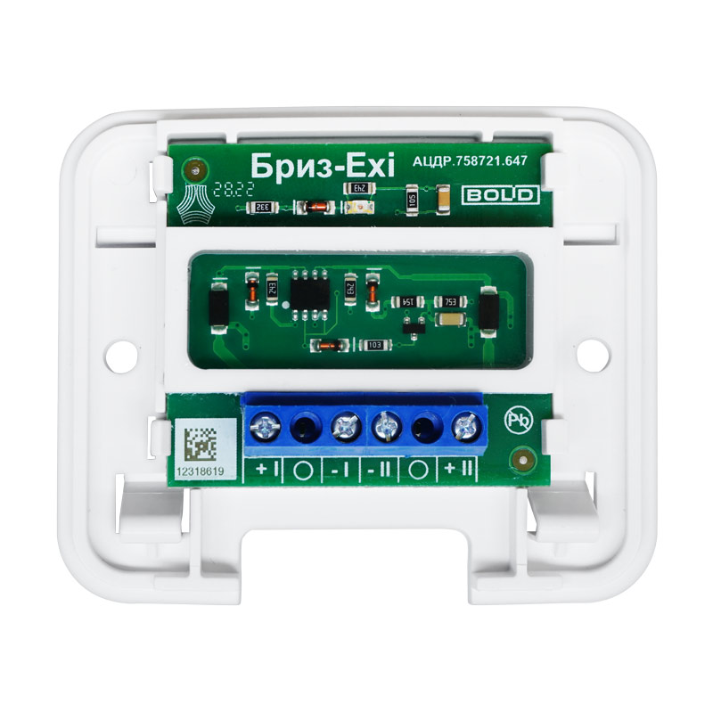 БРИЗ-Exi — это специализированный взрывозащищённый блок разветвительно-изолирующего типа, предназначенный для эксплуатации во взрывоопасных помещениях. Он устанавливается в искробезопасную двухпроводную линию связи контроллеров «С2000-КДЛ» и автоматически изолирует участок при коротком замыкании, восстанавливая связь после устранения неисправности. Конструкция блока обеспечивает класс взрывозащиты «ia» для газовых смесей группы IIC при температурном классе T6, что подтверждается маркировкой 0Ex ia IIC T6 Ga. Внутри корпуса применены стабилитроны для ограничения входного напряжения, лакокрасочное покрытие и компаундинг, обеспечивающие требуемые электрические зазоры и устойчивость к внешним воздействиям.