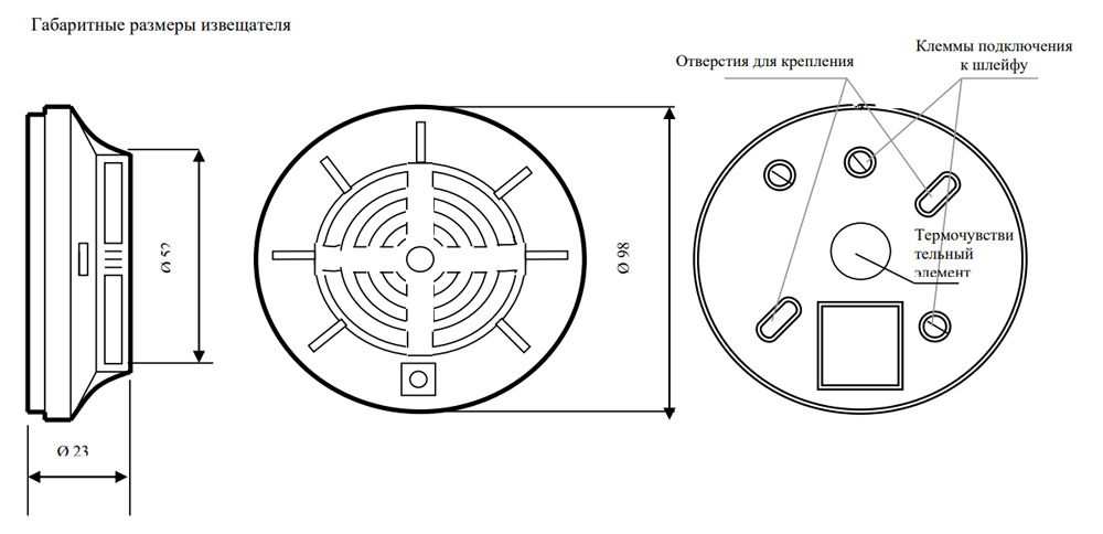Извещатель выдает информацию о пожаре в шлейф пожарной или охранно-пожарной сигнализации приборов приемноконтрольных путем размыкания сухих контактов извещателя.