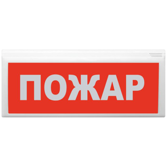 При пожаре оповещатель мигающим световым табло с надписью «ПОЖАР» информирует о возгорании и необходимости эвакуации.