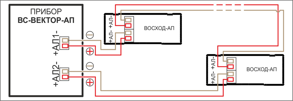 - К адресной линии прибора «ВС-ВЕКТОР-АП250» может быть подключено до 200 оповещателей «ВОСХОД-АП-02».