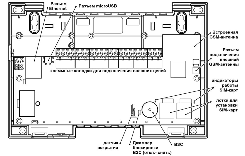 - Два универсальных входа/выхода с возможностью работы как ШС или исполнительные выходы