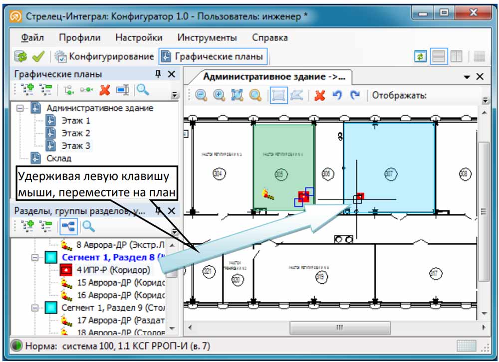 - Размещение на графических планах физических устройств и логических объектов (зоны/группы зон, группы выходов)
