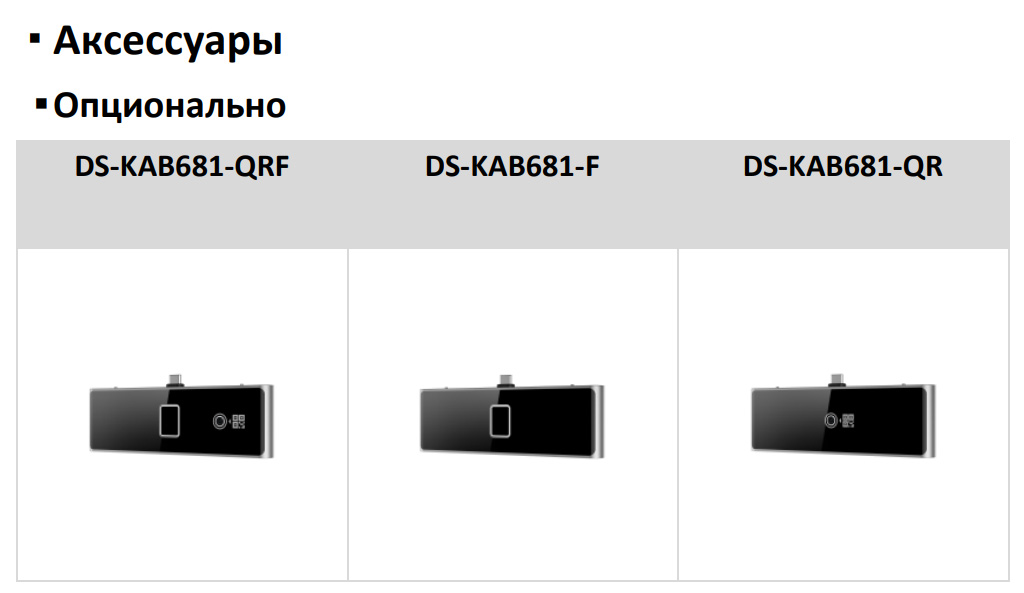 • Поддержка подключения периферийных модулей: DS-KAB681-QR,DS-KAB681-F, DS-KAB673-FB, DS-KAB681-QRF (QR: QR код; F: отпечатки пальцев)