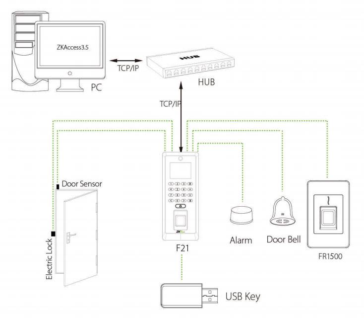 Биометрический считыватель ZKTeco FR1500-WP применяется для организации двухсторонних точек прохода через дверь при использовании биометрического терминала F21.