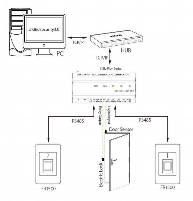При построении биометрических систем контроля доступа на базе контроллеров inBIO, FR1500-WP используется как считыватель пальцев на вход и выход.