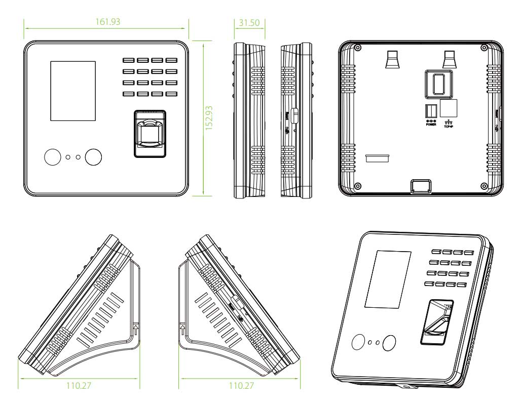 • Функции: ADMS, DST, Self-service Query, Automatic Status Switch, T9 Input, Camera, 9-digit User ID, Multiple Verification Methods, Bell Scheduling, SSR