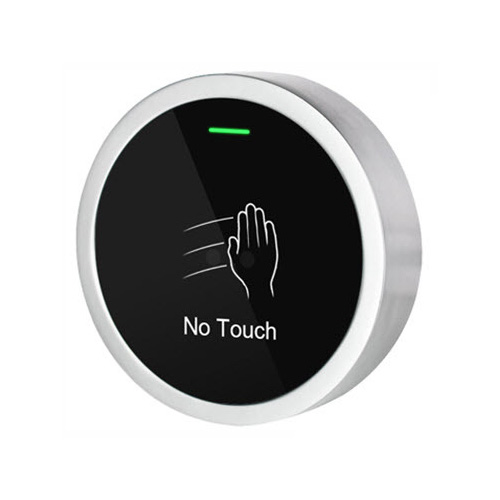 Бесконтактная кнопка выхода в металлическом корпусе круглой формы.