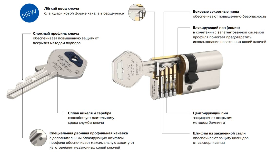 Достигается благодаря перекрывающемуся профилю ключа и специальной конструкции пинов.