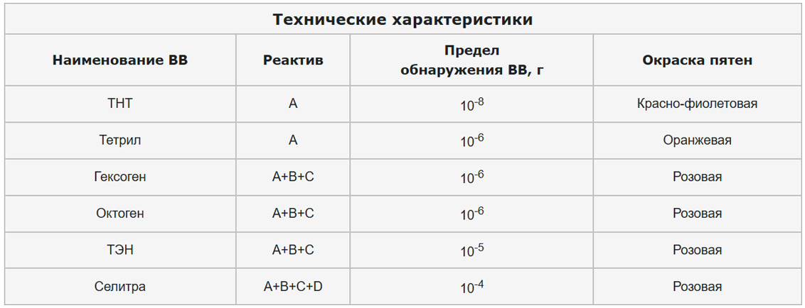 В случае, когда проведение анализа с реактивом А не показало наличие следов ВВ, следует провести второе исследование. На салфетку с пробой нужно накапать сразу три реактива (А, В и С). И если после этого пятно станет розовым, значит, в пробе в следовых количествах присутствует гексоген, октоген или ТЭН.