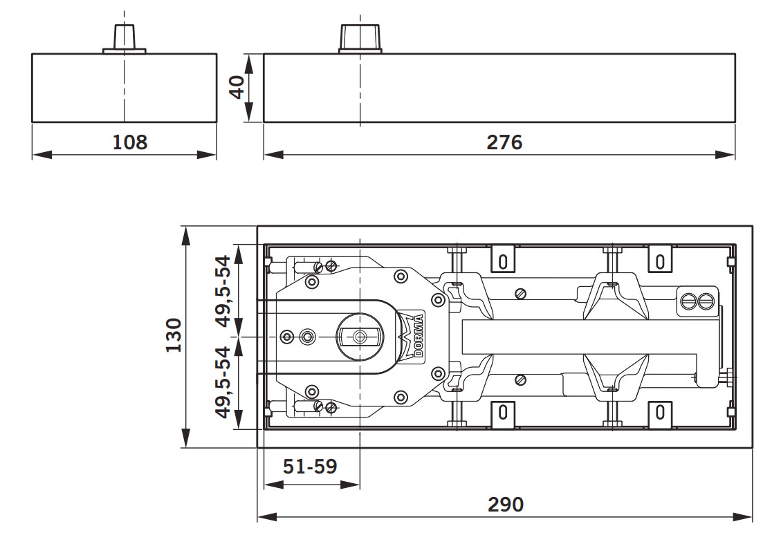 Напольный доводчик для маятниковых дверей с гидравлически контролируемым циклом закрывания от 130° и торможением открывания, в комплекте с цементным коробом. Сертифицирован в соответствии со стандартом EN 1154.