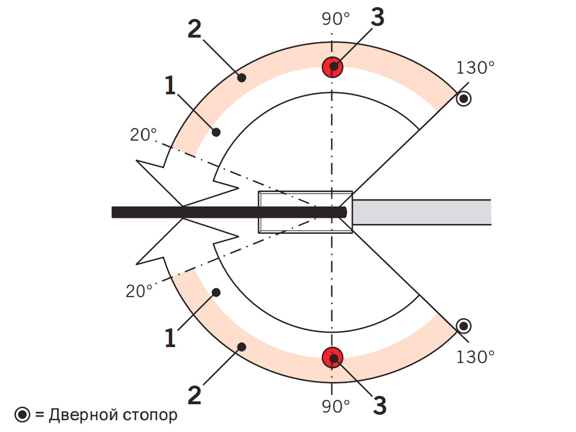 ** Максимальный угол открывания – 130°. Если есть вероятность открытия двери более чем на 130°, необходимо использовать дверной стопор.