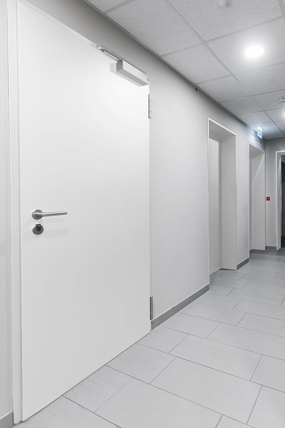С электромеханическим устройством фиксации открытого положения и встроенным детектором дыма для одностворчатых дверей