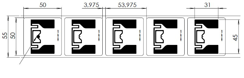 Метка представляет собой PET плёнку с установленным на ней оригинальным чипом UCODE8 от компании NXP, совмещенным с антенной размером 45х31 мм, сверху укрытую бумажным слоем адаптированным для печати на термотрансферном принтере. Снизу размещен клеевой слой, защищённый силиконизированной бумагой. Работает в частотном диапазоне UHF 865-868 МГц. Выпускается серийно на собственном производстве компании ISBC в г. Зеленограде.