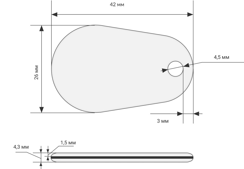 Размеры: 42 х 26 мм, толщина 4.3 мм. Диаметр отверстия 4.5 мм