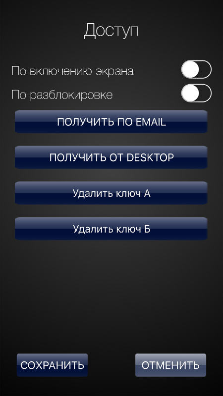 Наличие ключей доступа в Вашем смартфоне и удаление ключей можно произвести так же через настройки: длительно удерживайте кнопку «настройки», до появления экрана «Доступ».