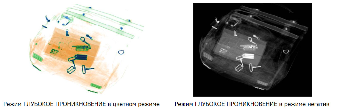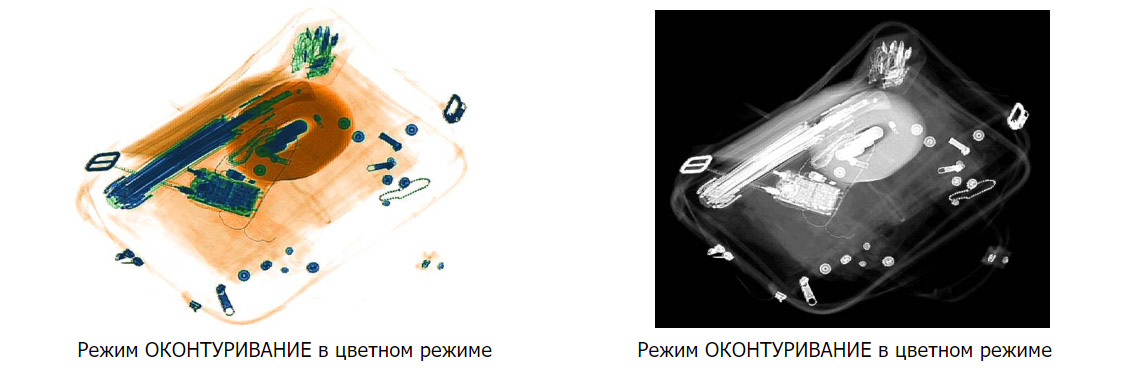 • Вывод изображения досматриваемых объектов в 6-ти цветах, в зависимости от атомного числа. 6-ти цветное отображение облегчает оператору идентификацию материалов досматриваемого объекта и ускоряет саму процедуру досмотра