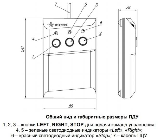 На лицевой панели корпуса ПДУ расположены три кнопки для задания режимов работы калитки. Средняя кнопка STOP предназначена для блокировки створки калитки в закрытом положении. С помощью левой LEFT и правой RIGHT кнопок можно открыть створку калитки в соответствующую сторону для однократного прохода. Также может быть установлен режим свободного прохода. Над кнопками расположены световые индикаторы. В корпусе ПДУ установлен зуммер для звуковой индикации.